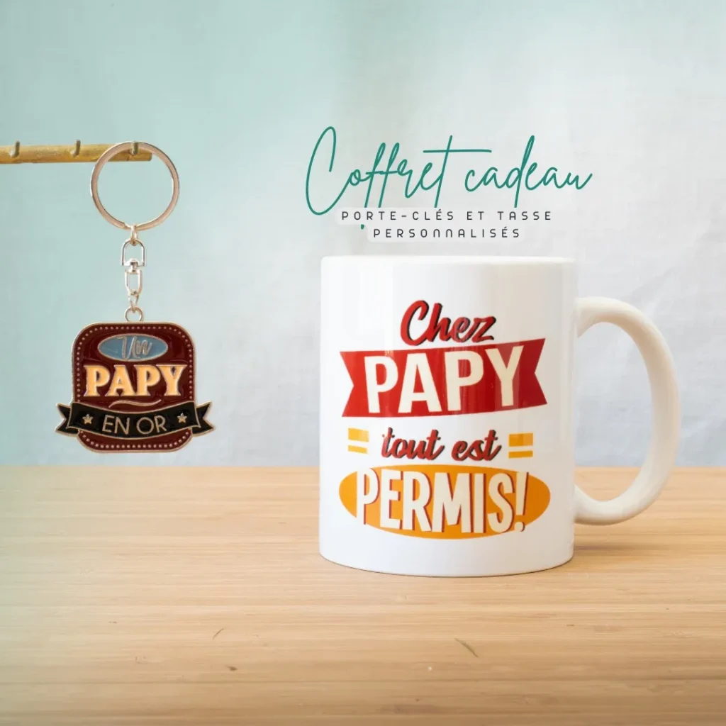 “Chez Papy, tout est permis, parce qu’il est en or !” 🥰 Pour la Fête des Grands Pères, offrez à votre grand-père un coffret cadeau unique comprenant un mug et un porte-clés 👴🏻